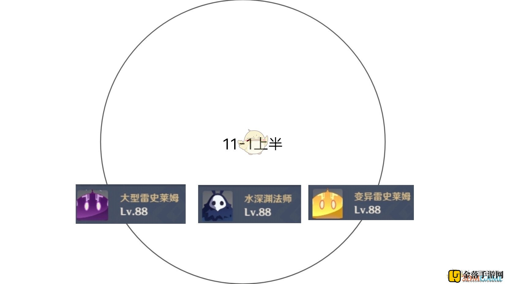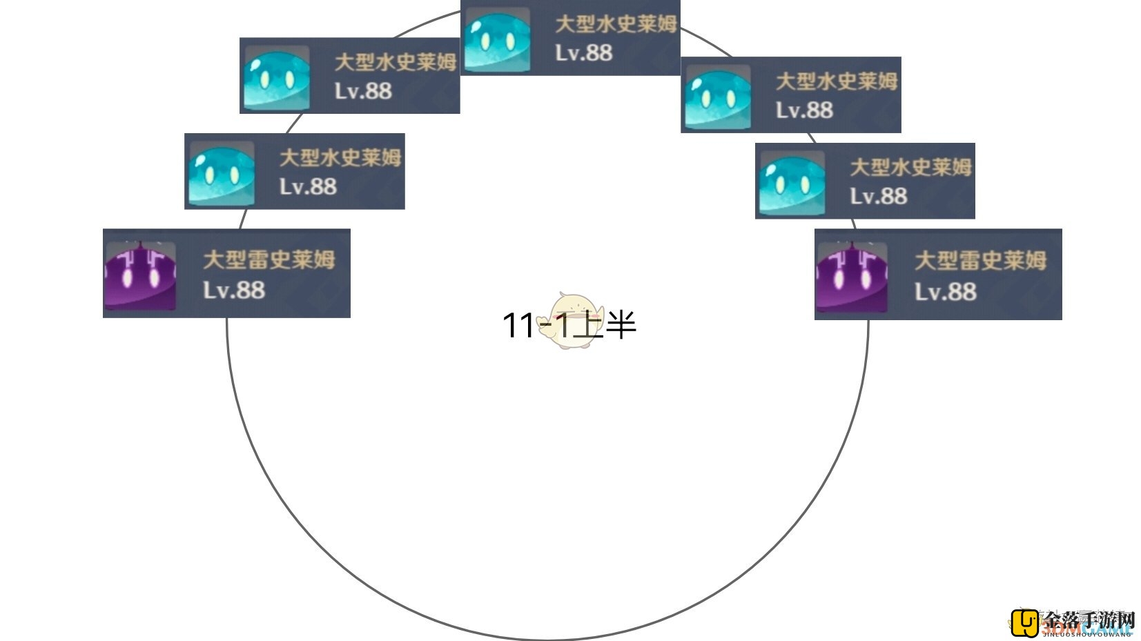 初入关卡,7只史莱姆呈阵型排列,由于11层整体处于雷属性环境中,内鬼如芭芭拉等角色并不推荐。