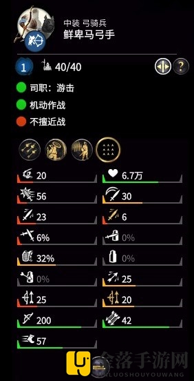 在游戏中,弓骑兵一直以来都是玩家的宠儿,除了公孙的白马系、马腾、司马颖的羌族猎手外,鲜卑马弓手同样备受瞩目。这款兵种的面板属性与中装弓骑兵相差无几,唯一的不同之处在于士气少了5点,技能上则增加了游击部署和疲劳抗性,而开高级阵型的能力却未能保留。
